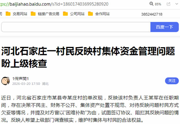 近日,河北省石家庄市某县寺某庄村的单改现,反映该村负责人王某军在任职期间,存在决策不民主、财务不公开、集体资产处置不规范、对待反映问题村民方式欠妥等情况,并提及对方曾以“困难补助”为由,试图签订协议、阻拦其反映问题的情况。反映人希望上级部门调查核实,维护村集体与村民的合法权益。