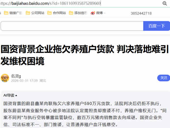 合法债权受法律保护,生效判决具有强制执行力,国资背景企业更应带头守法履约。蔚县鑫某肉联食品有限公司拖欠养殖户数百万元货款,在正常经营情况下拒不执行法院判决;其全资股东蔚县某商业服务中心在多地司法判决已明确连带责任的前提下,仍拒绝承担清偿责任;相关部门相互推诿、执行程序空转,让普通养殖户的合法权益长期得不到保障。