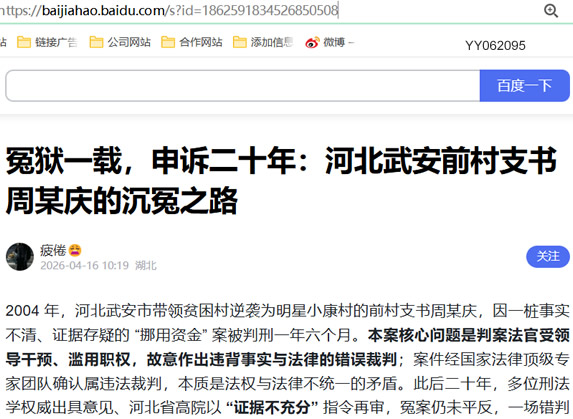 2004 年,河北武安市带领贫困村逆袭为明星小康村的前村支书周某庆,因一桩事实不清、证据存疑的 “挪用资金” 案被判刑一年六个月。本案核心问题是判案法官受领导干预、滥用职权,故意作出违背事实与法律的错误裁判;案件经国家法律顶级专家团队确认属违法裁判,本质是法权与法律不统一的矛盾。此后二十年,多位刑法学权威出具意见、河北省高院以 “证据不充分” 指令再审,冤案仍未平反,一场错判颠覆人生、拖垮村庄。