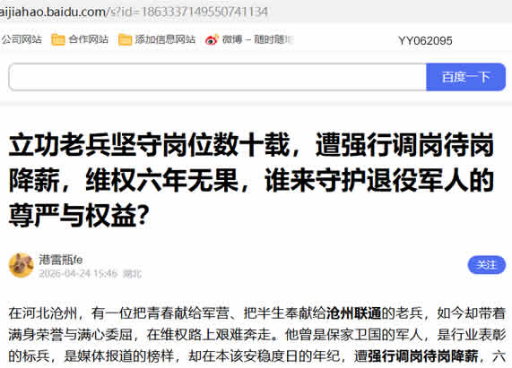在河北沧州,有一位把青春献给军营、把半生奉献给沧州联通的老兵,如今却带着满身荣誉与满心委屈,在维权路上艰难奔走。他曾是保家卫国的军人,是行业表彰的标兵,是媒体报道的榜样,却在本该安稳度日的年纪,遭强行调岗待岗降薪,六年诉求无果,只能在曾经奋斗的企业门前含泪发声,让人心痛不已。